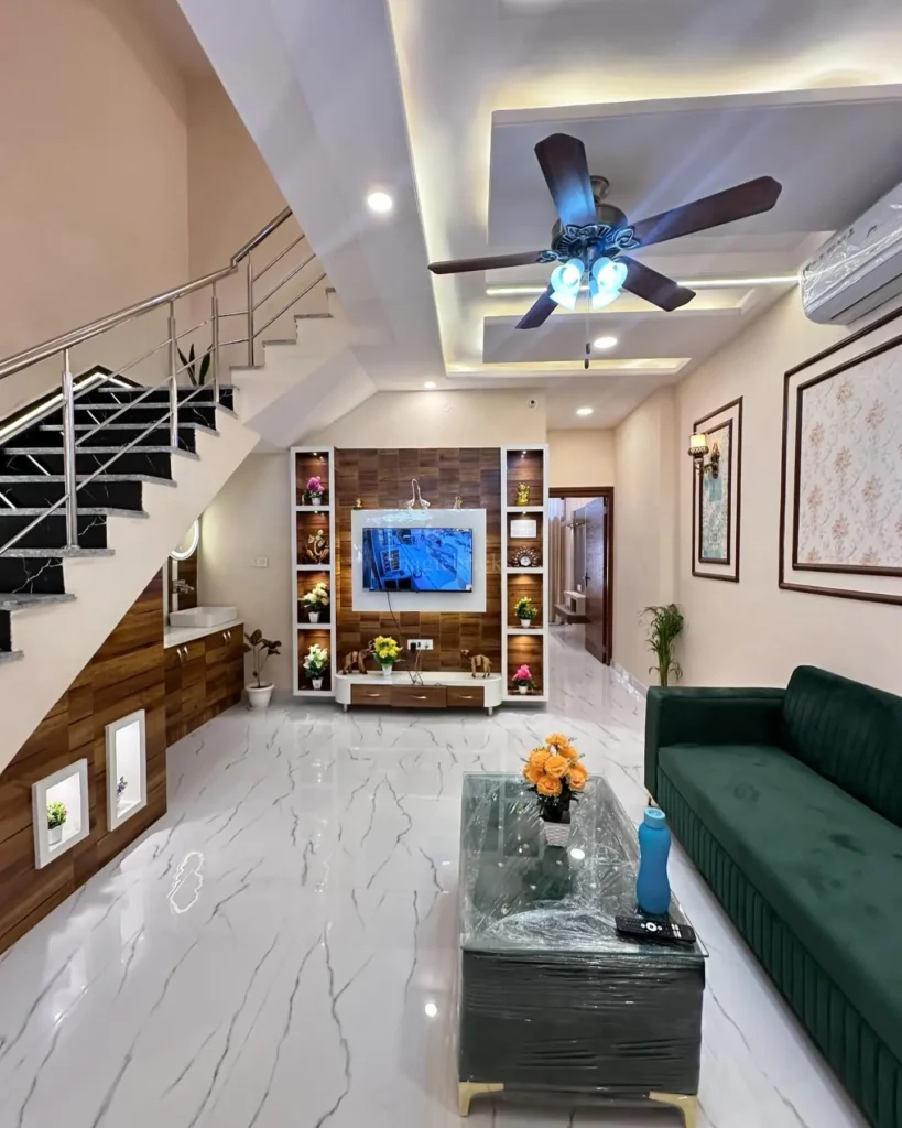 False Ceiling with Cove Lighting: Ceiling mein warm LED cove lighting aur recessed lights use ki gayi hain, jo room ko soft aur elegant look deti hain.Designer Ceiling Fan: Wooden finish ke blades ke saath stylish ceiling fan, jo décor ke saath perfectly match karta hai.TV Unit Wall Design: Wooden panel background ke saath modern TV unit aur open shelves, jisme décor items aur plants display kiye gaye hain.Premium Flooring: White marble-look vitrified tiles, jo poore living area ko bright aur spacious feel dete hain.Comfortable Seating: Dark green upholstered sofa, jo room ko rich aur royal touch deta hai.Glass Center Table: Modern glass coffee table with sleek finish, jo overall design ko balanced look deta hai.Staircase Design: Stainless steel railing ke saath modern staircase, jo space ko stylish aur safe banata hai.